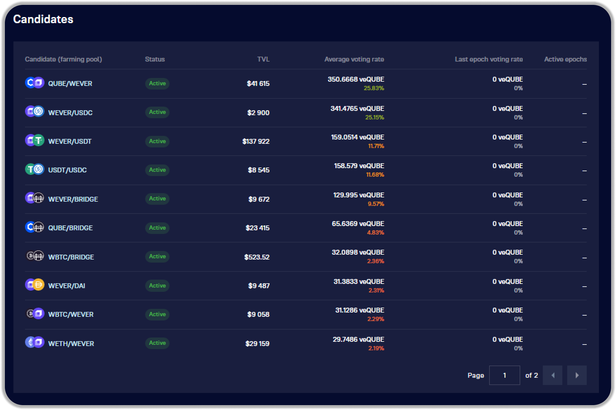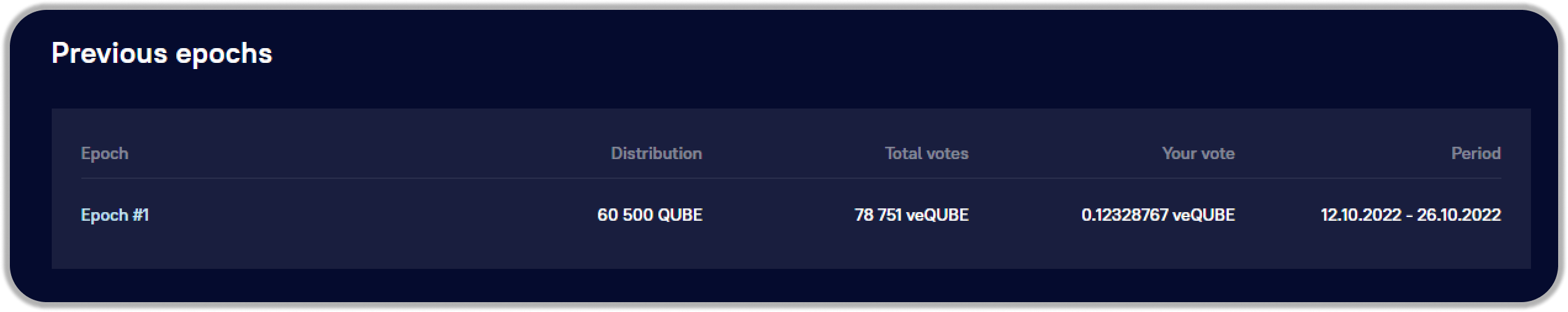 Last epoch voting rate - the percentage of veQUBE cast by voting participants to vote for a candidate out of the total number of veQUBE used for voting in the previous epoch.
