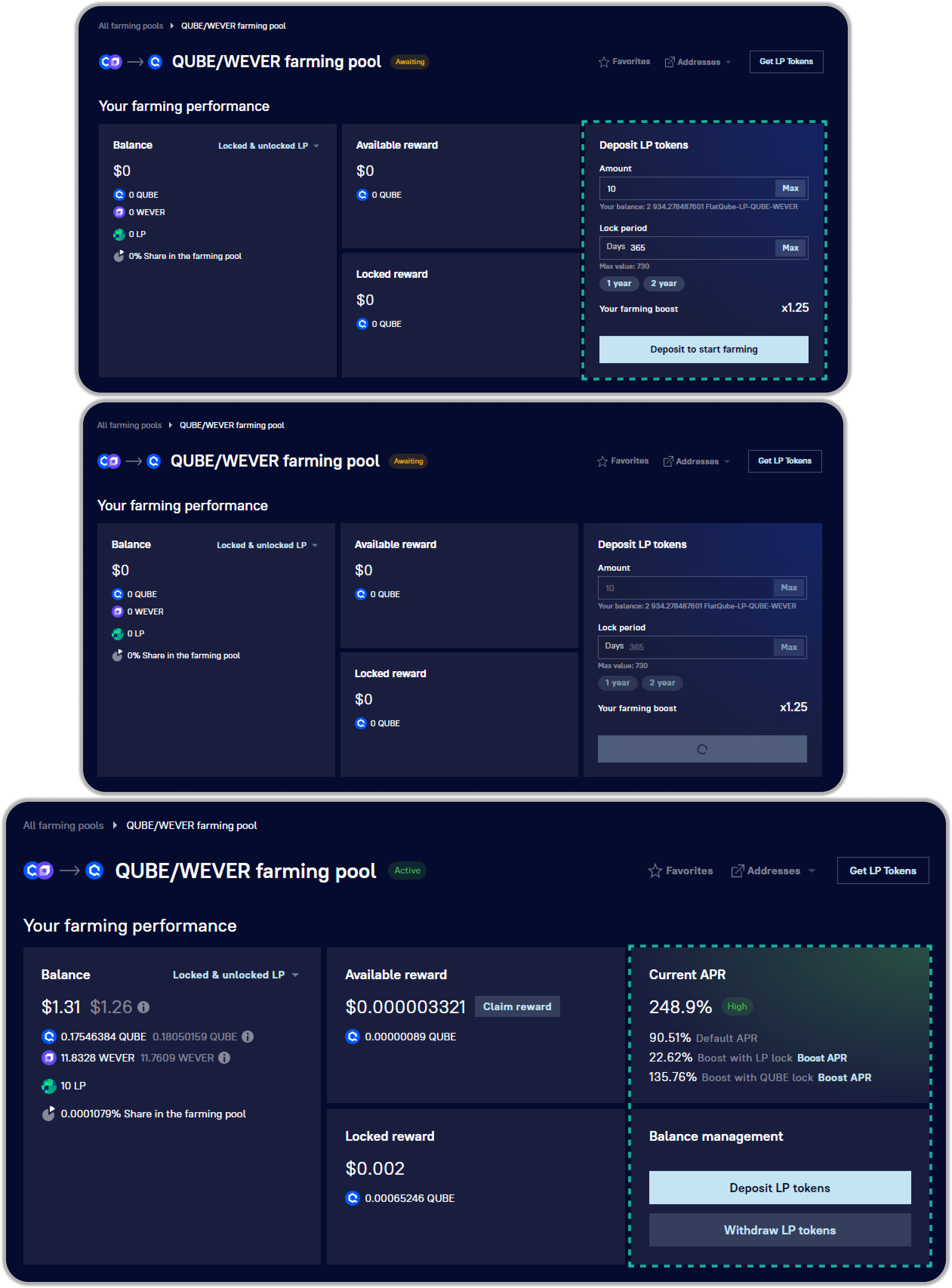 3. Enter the number of LP tokens that you want to deposit into this pool and select the token locking period. The longer the tokens remain locked, the greater the multiplier your farming speed.