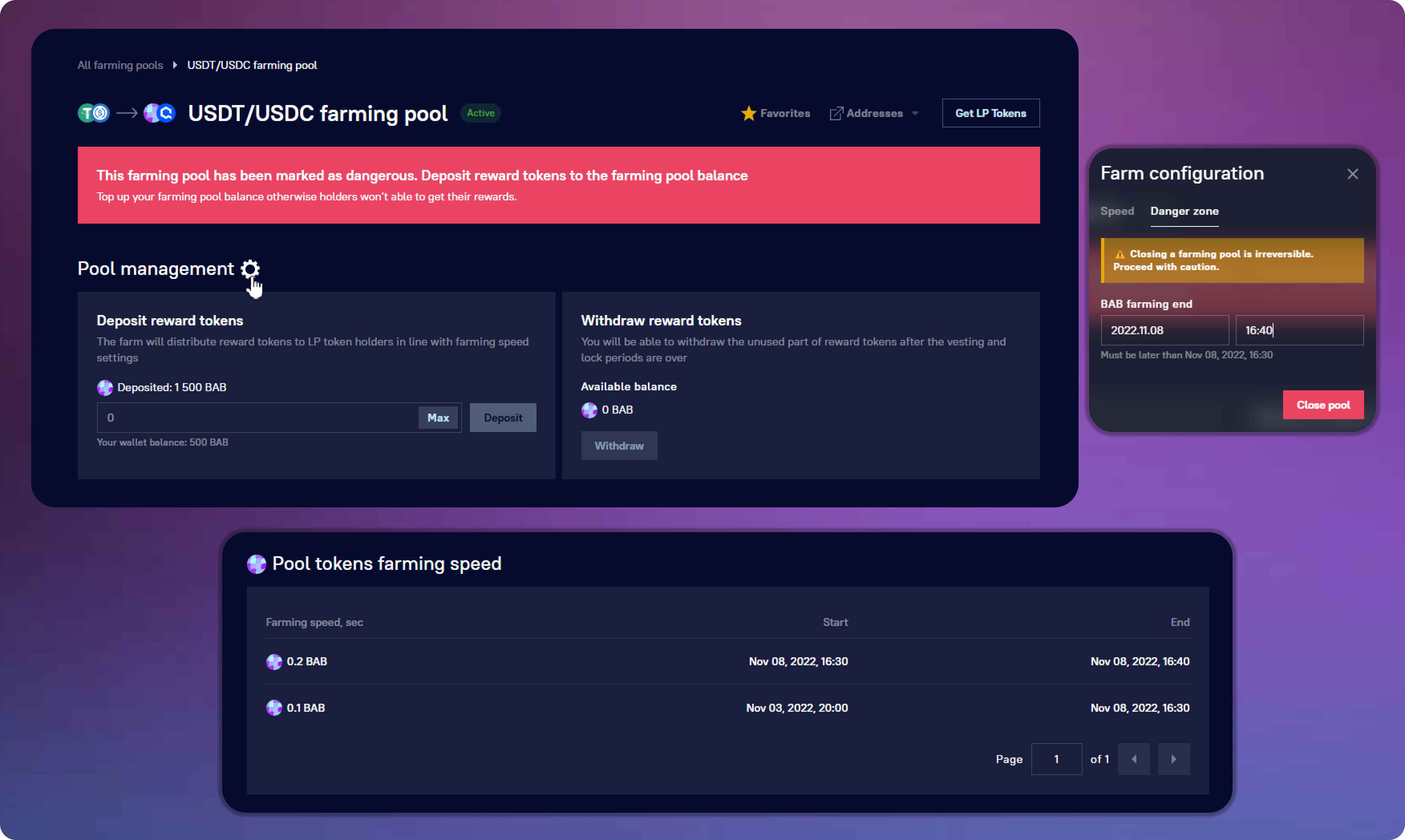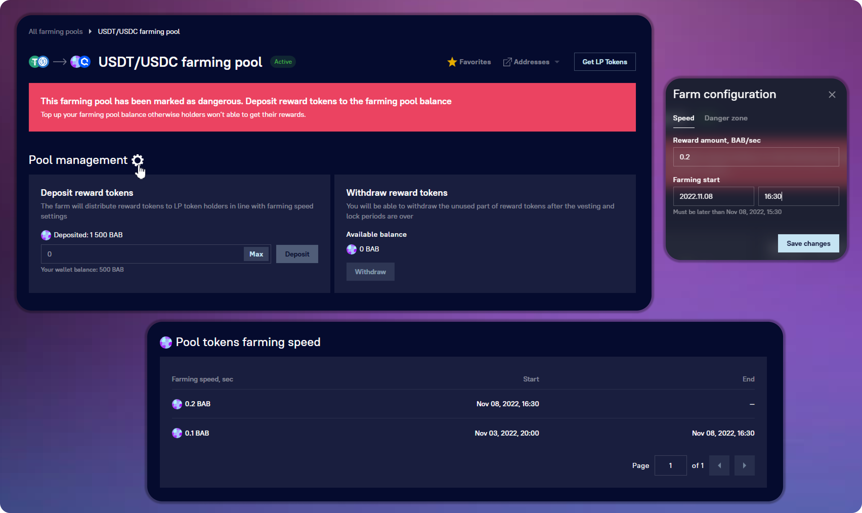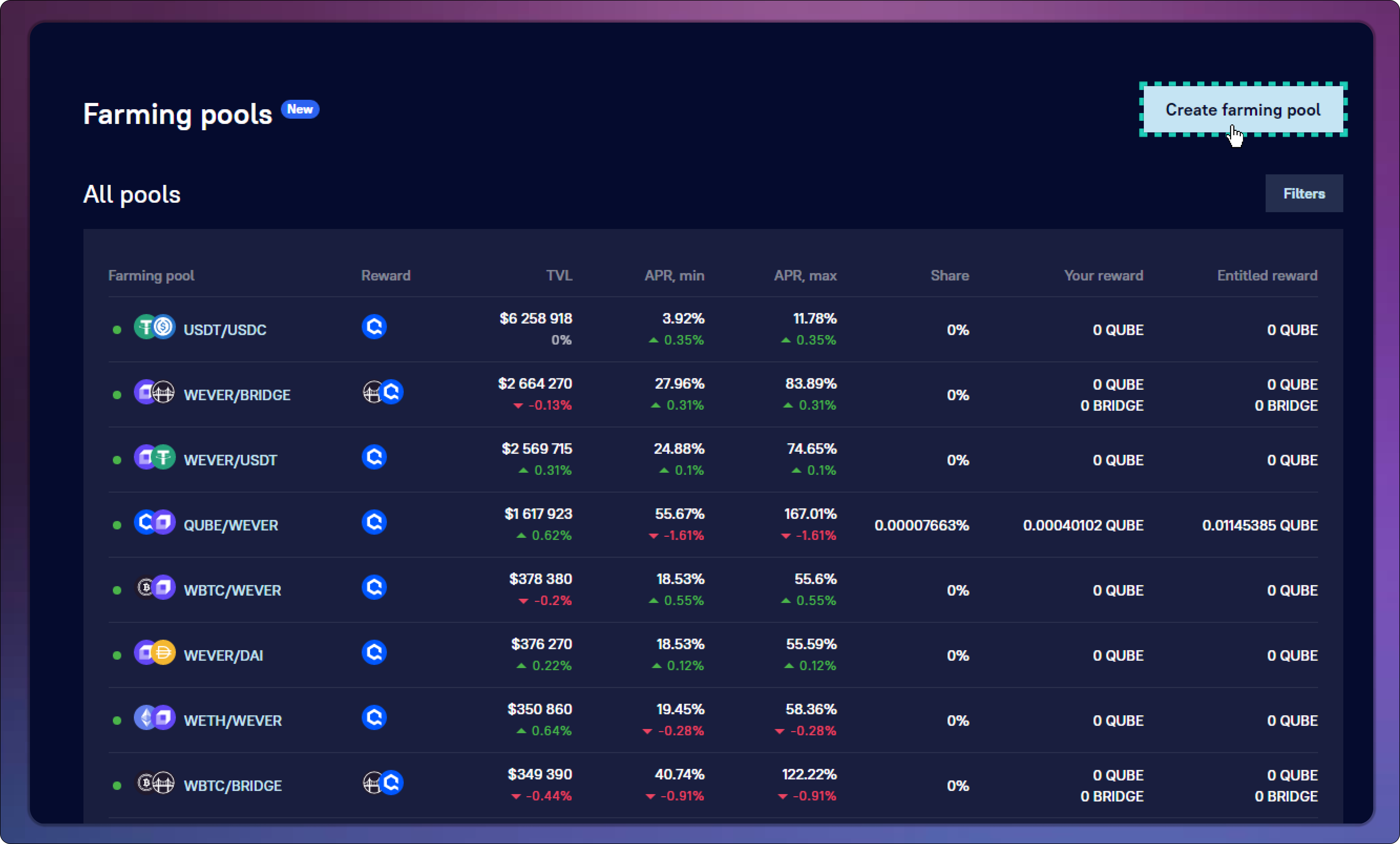 Thanks to the FlatQube functionality, you can create your own pools: choose a farming token, a reward, its distribution rate, etc.\