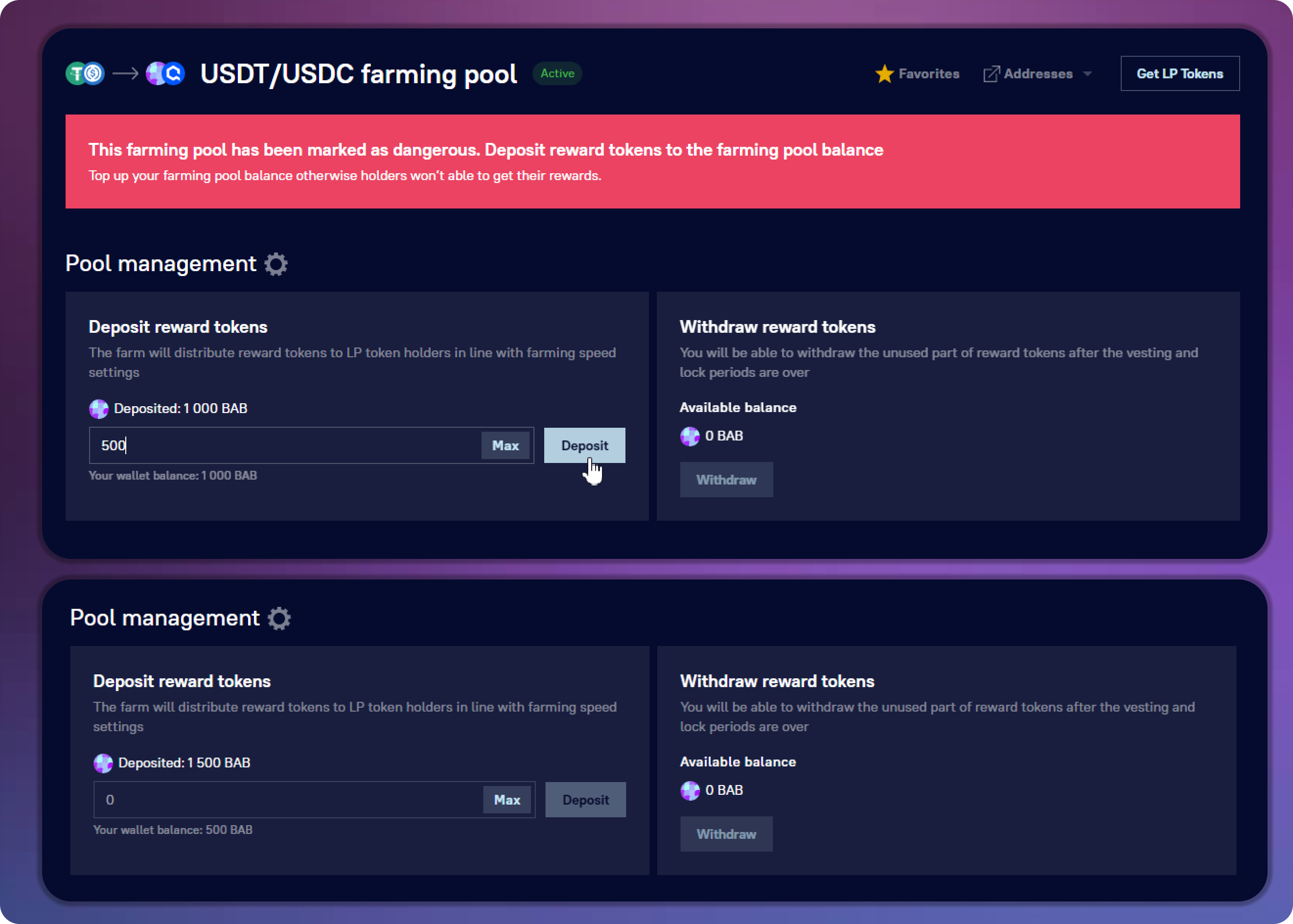 2. At the top of the Pool management block is the Deposit reward tokens block. Enter the number of tokens you want to deposit into the pool and click Deposit.