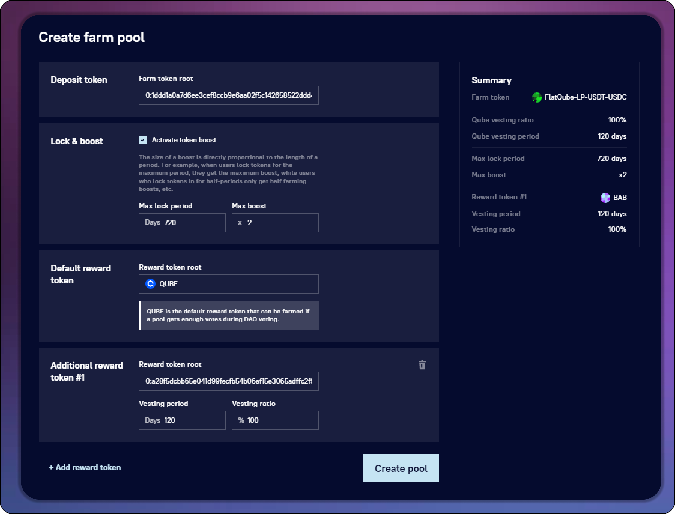 To do this, click **Add reward token** at the bottom left of the page, enter the root address of the token, the [vesting ](https://docs.flatqube.io/use/farming/concepts/vesting)period and the [vesting ](https://docs.flatqube.io/use/farming/concepts/vesting)ratio.