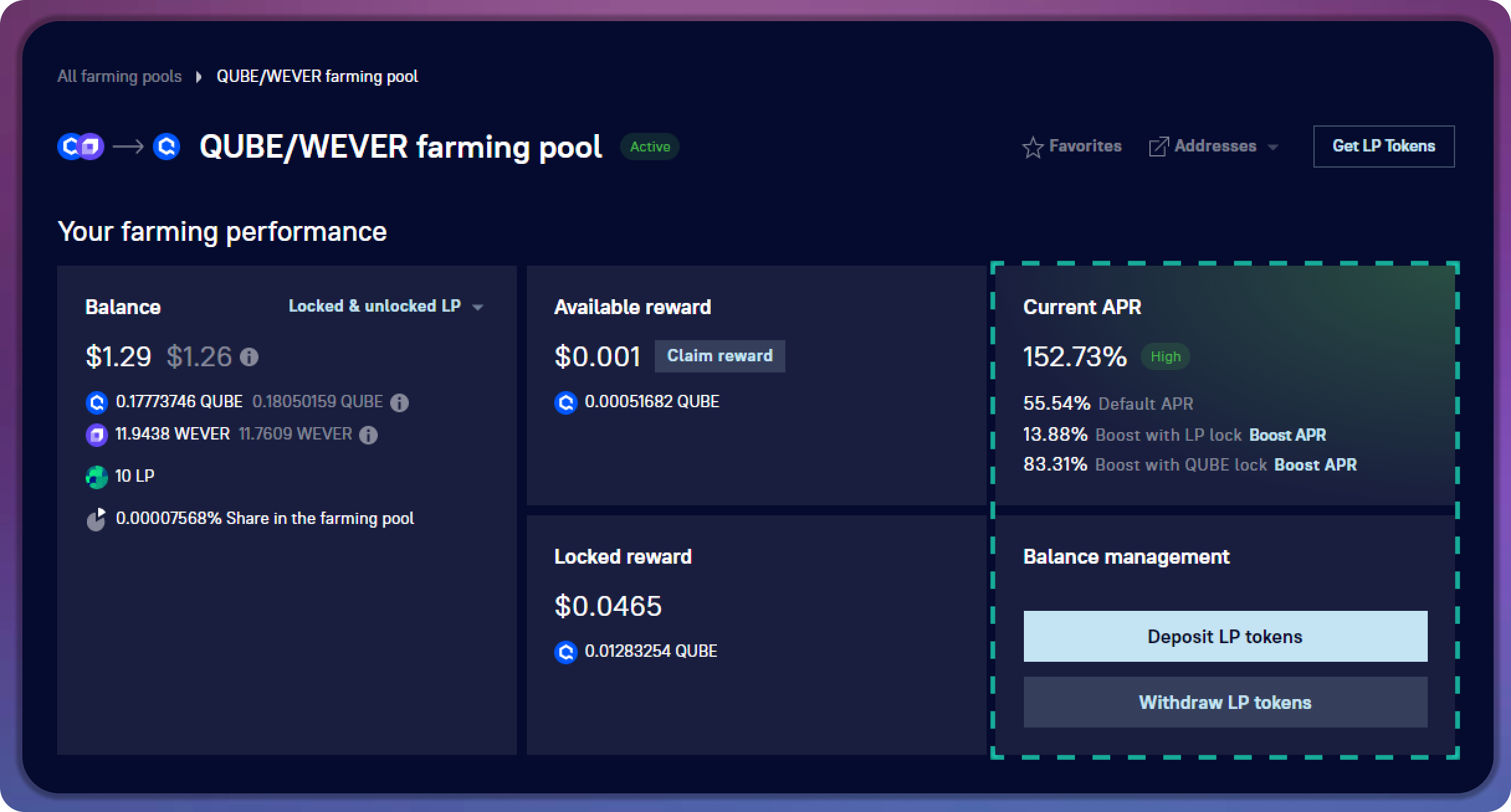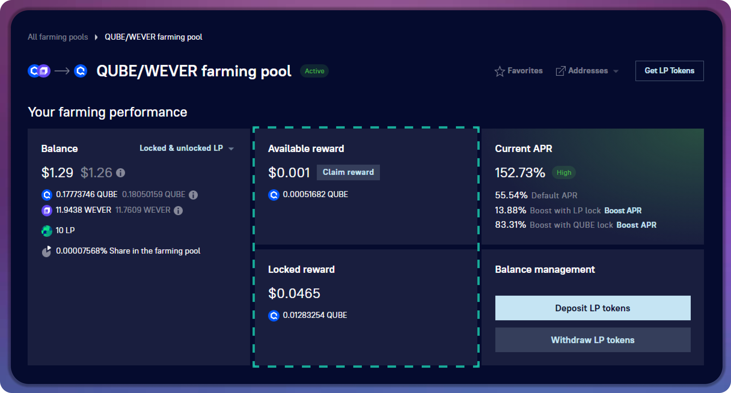Share in the farming pool reflects the percentage of your farming LPs from the total number locked in this farming pool. At the same time, it is a percentage of the total reward that you will receive at any given time.