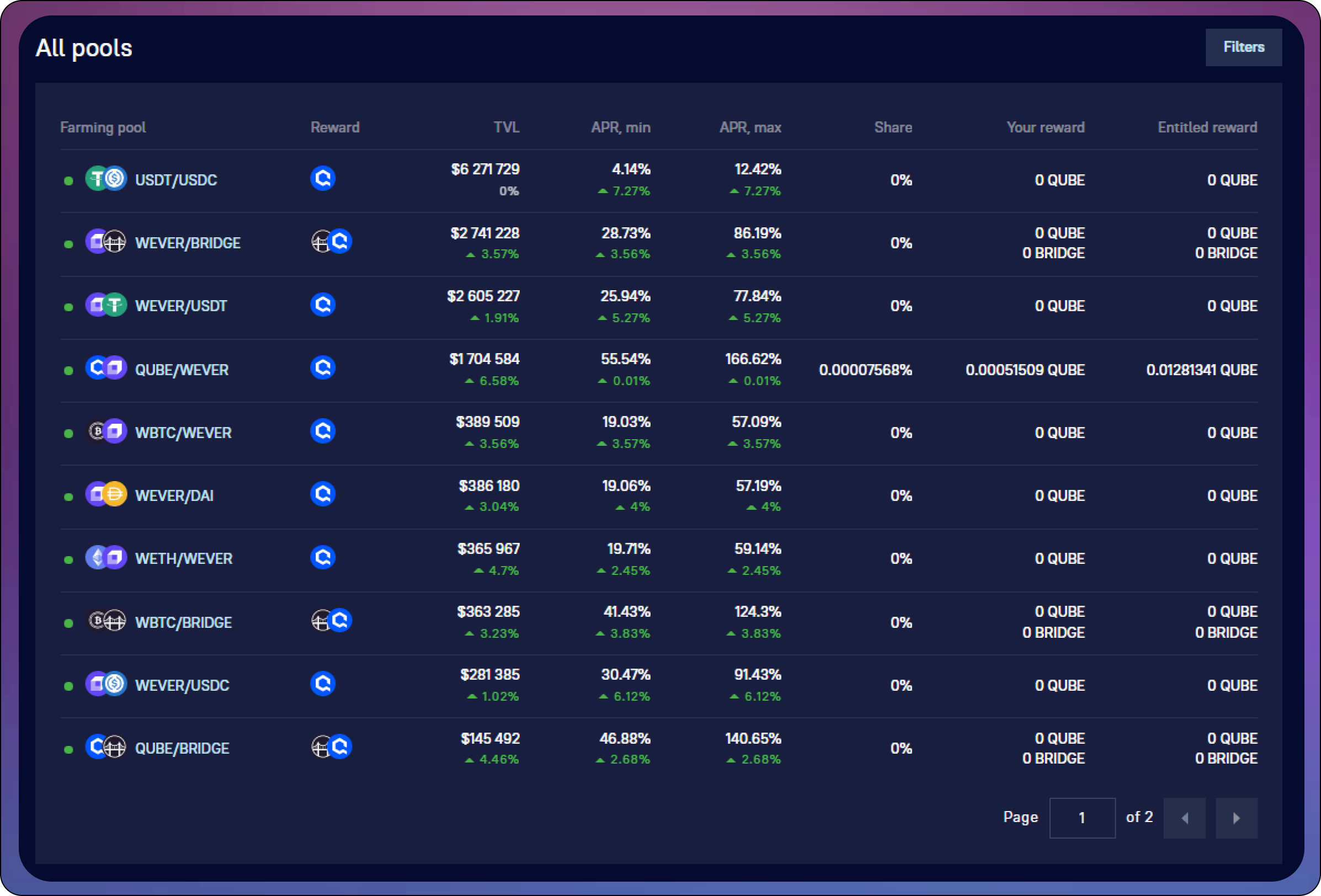 **Max. APR** is the profitability for the maximum boost coefficient for LP tokens and the boost for locking QUBE tokens.