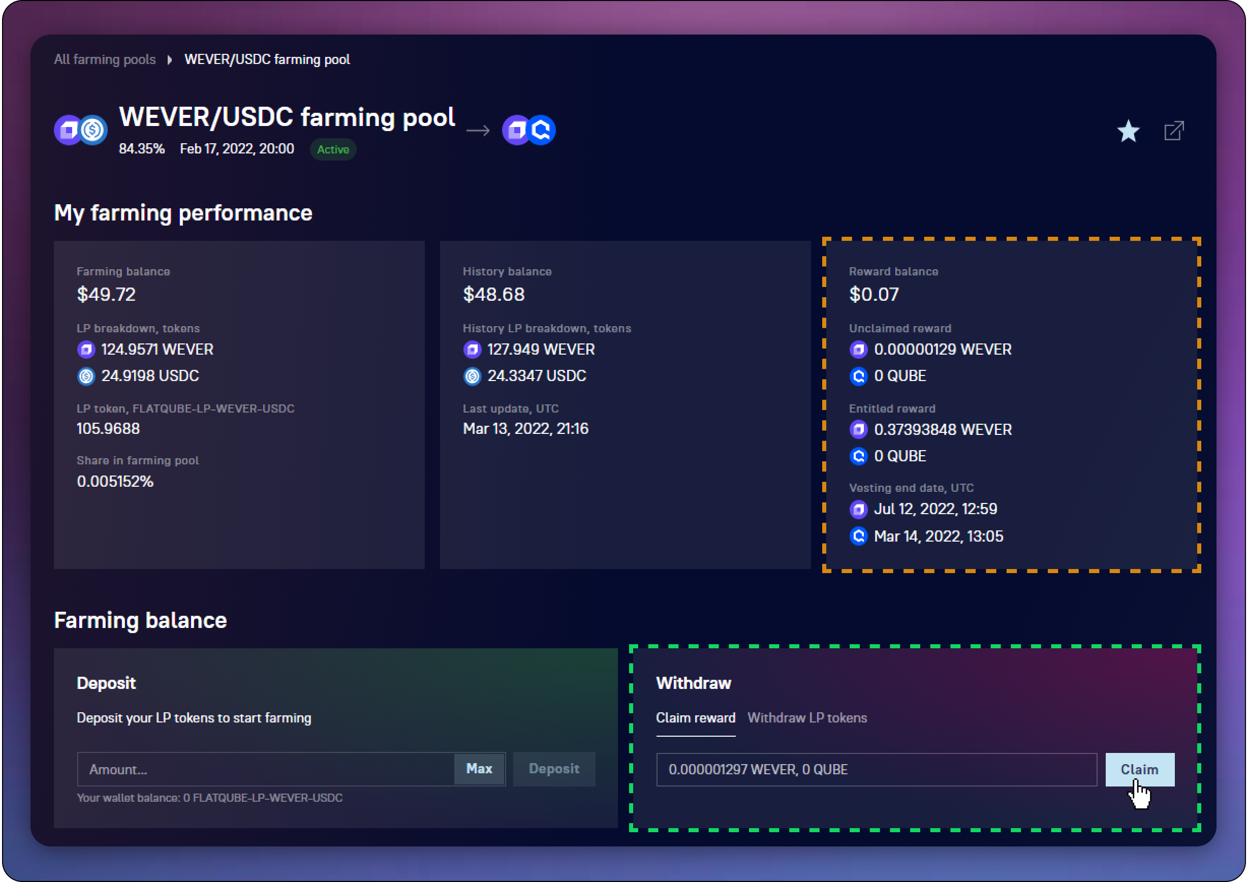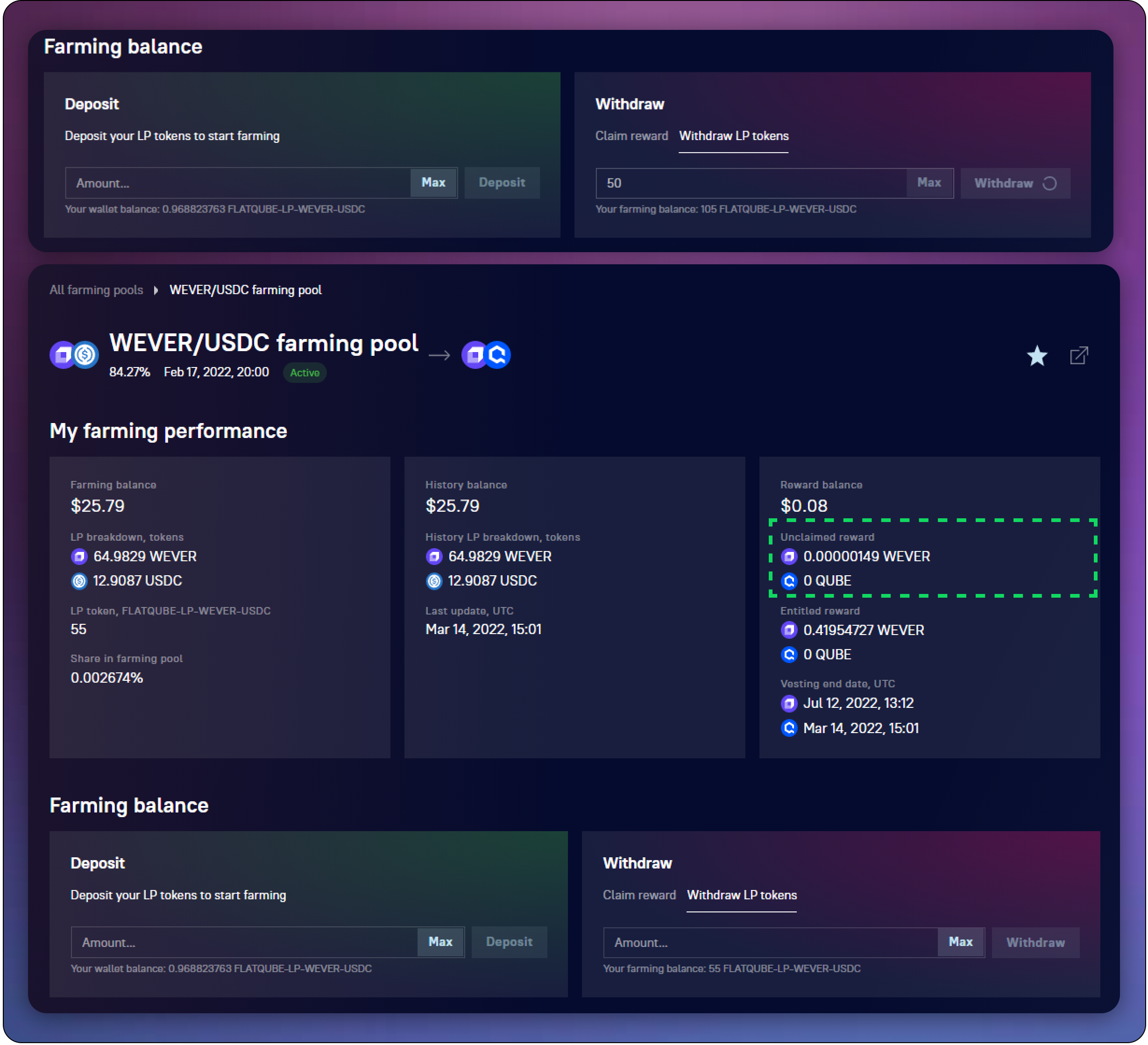 As you go through [**vesting**](https://docs.flatqube.io/use/farming/concepts/vesting), your **Entitled reward** is gradually unlocked from the **Unclaimed reward**, from where it can be withdrawn from your Dex account balance at any time.
