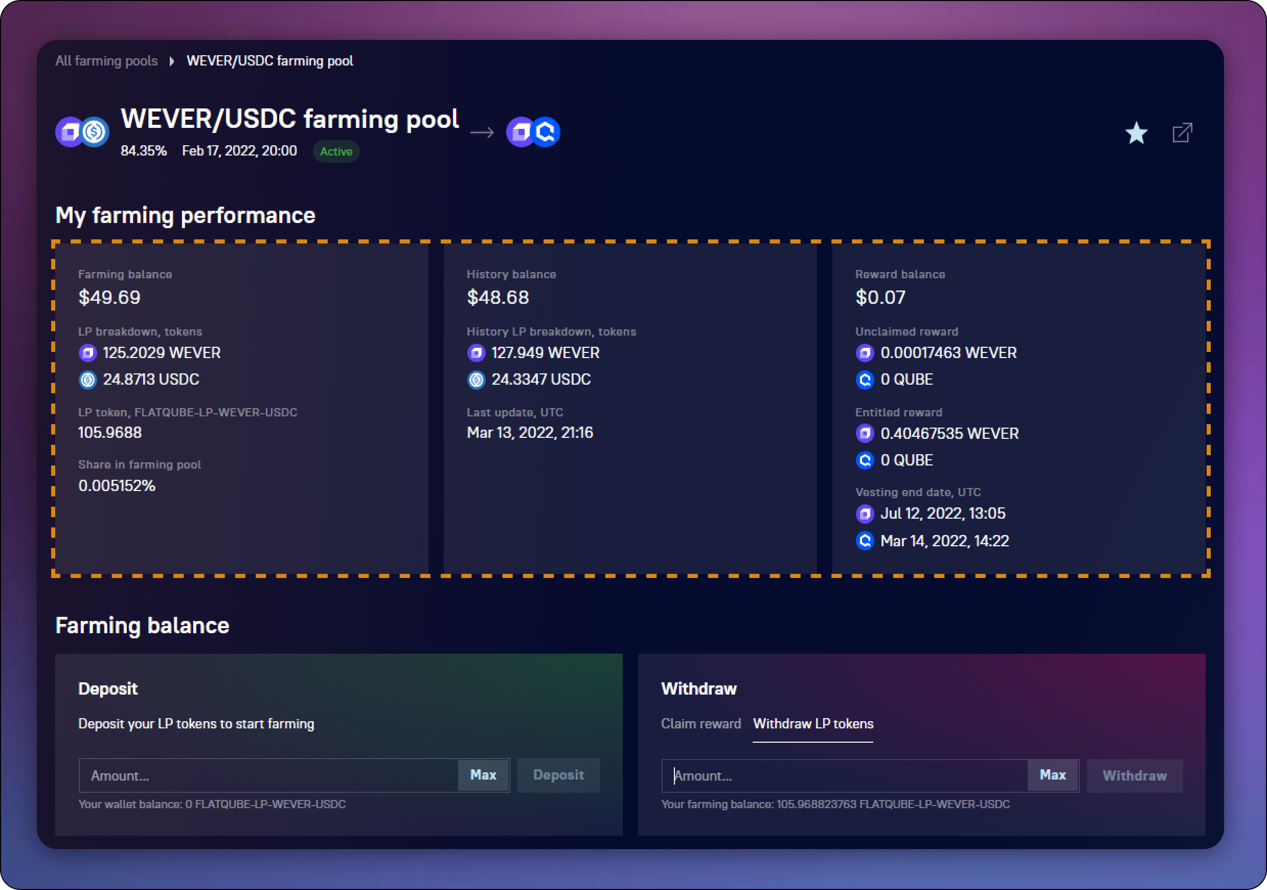 In order to see your Farming performance, go to the [**Farming section**](https://docs.flatqube.io/use/farming), and then to the page of the required pool.\