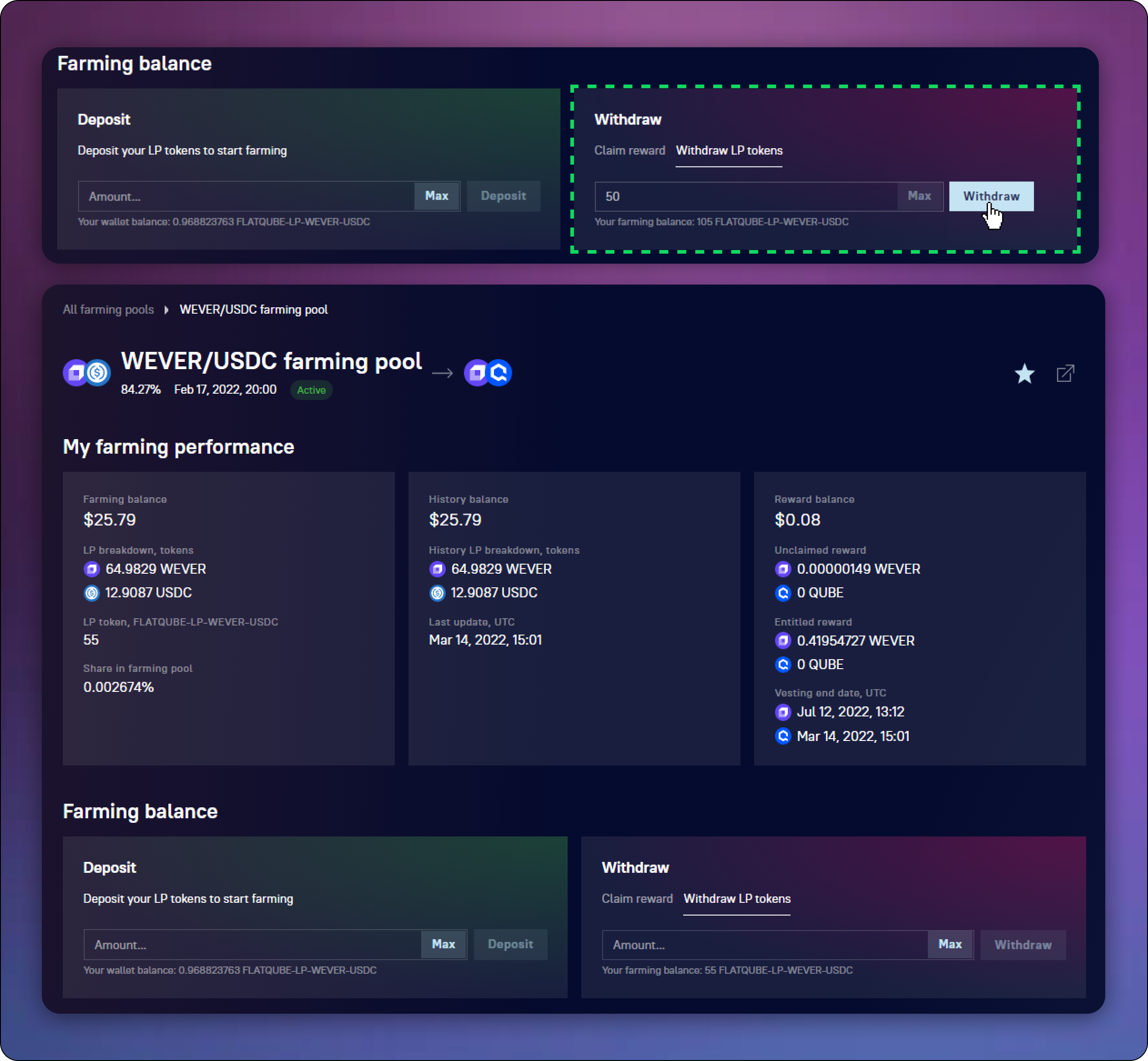 Enter the amount of farming tokens you want to withdraw and click **Withdraw**.
