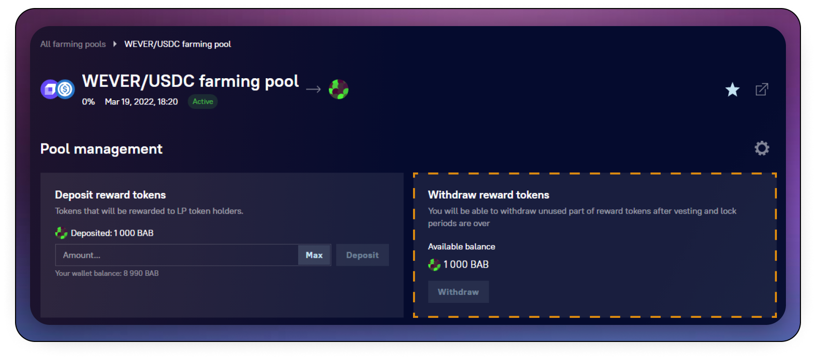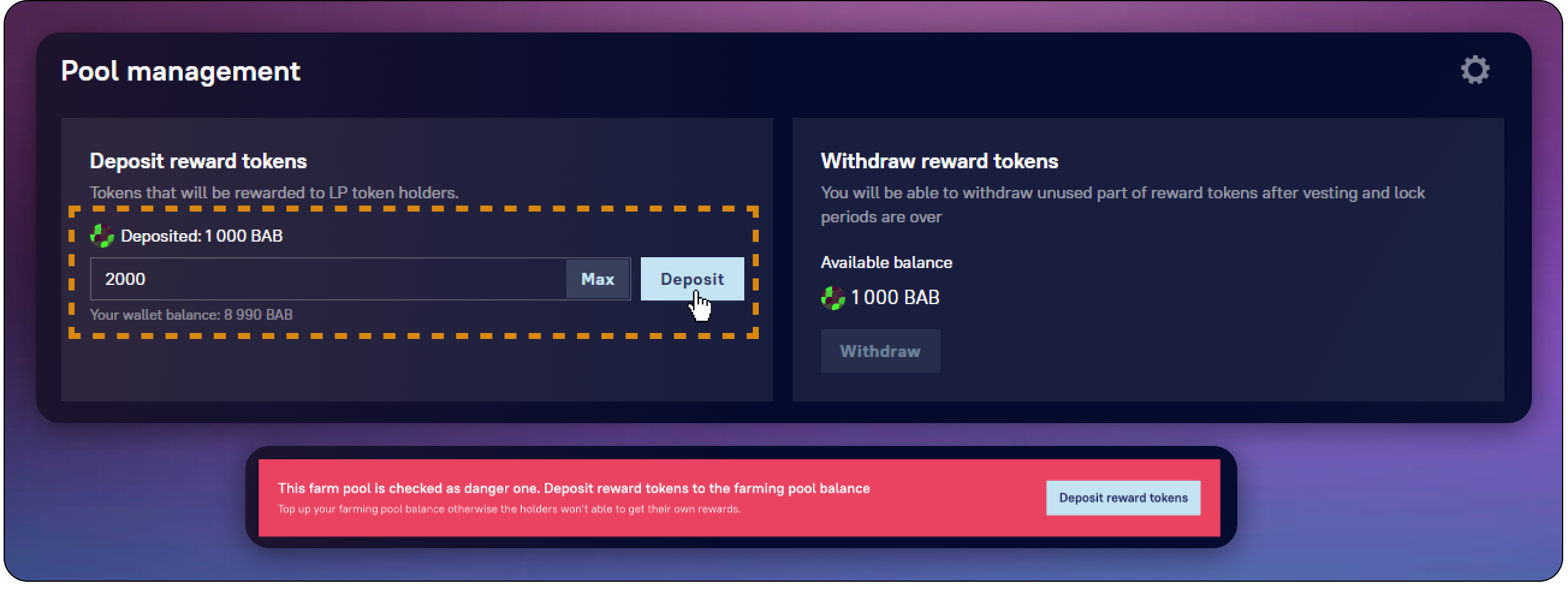 The administrator has to monitor the balance of the farming pool. If there are not enough tokens on the balance to pay all the rewards, the pool will be automatically marked with a danger icon in the general list.
