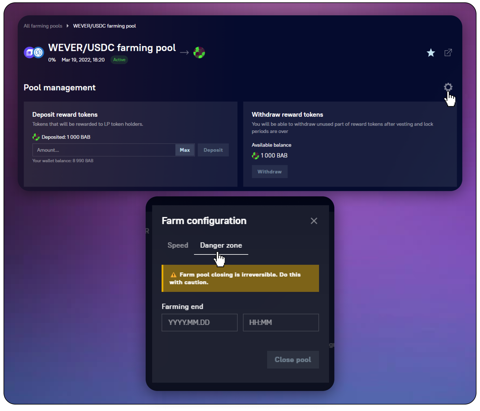 The administrator can at any time specify the date when the farming pool closes. At this point, the last unit of the reward will be distributed.