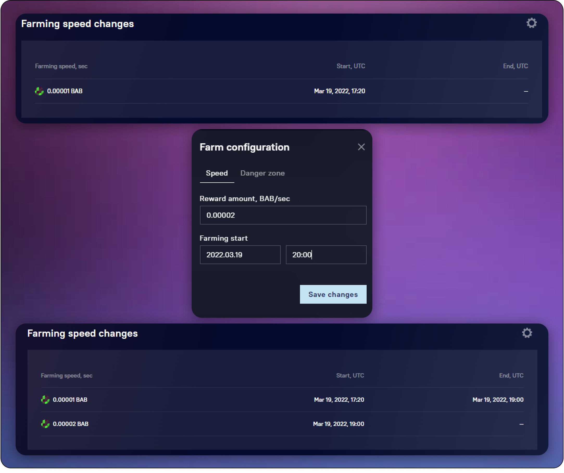 The administrator can increase or decrease the farming speed. To do that, one needs to indicate the start of a new farming period and a new farming speed.