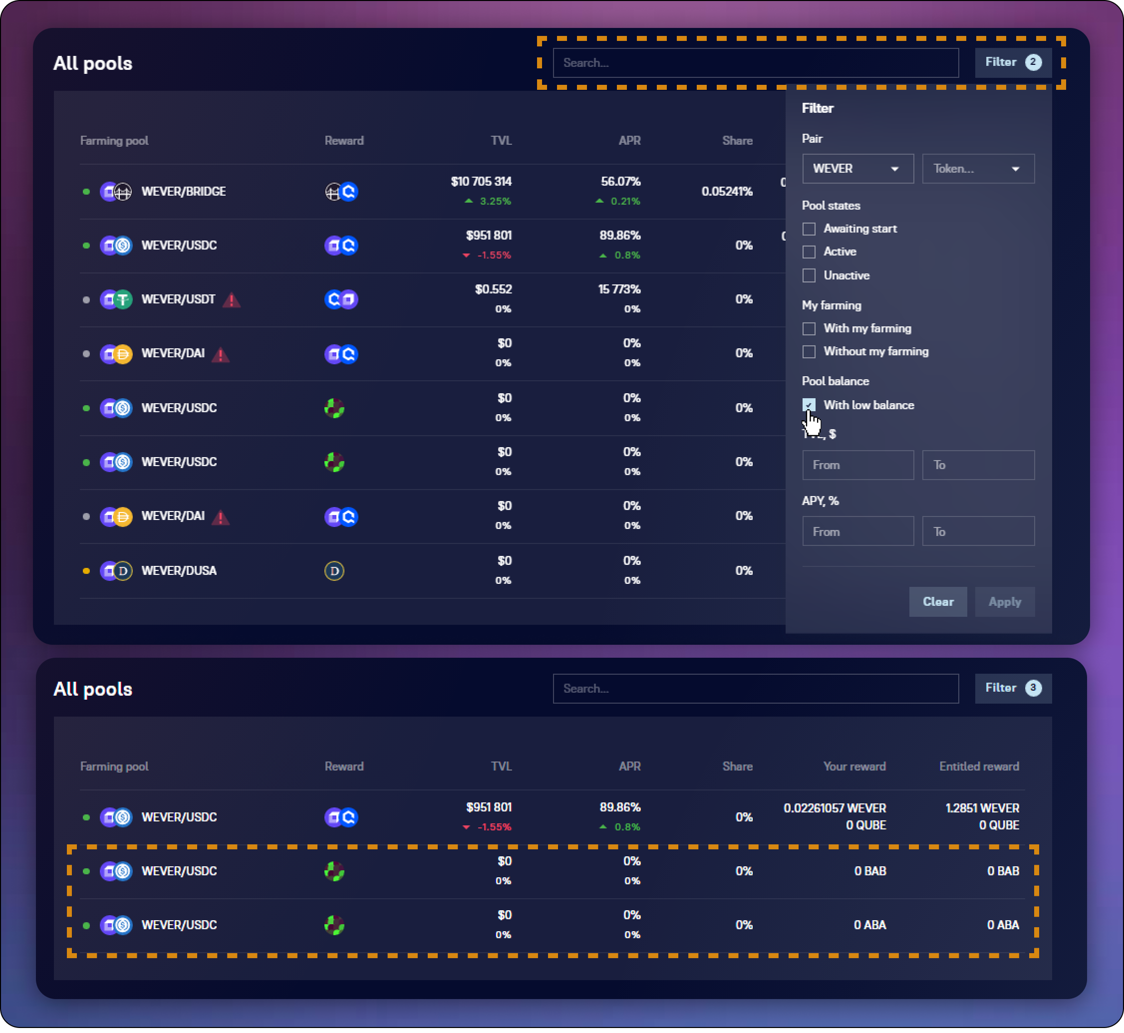 2. In the upper-right part of the **All pools** block, open the filter menu by clicking on the appropriate button and turn on the **With low balance** filter.