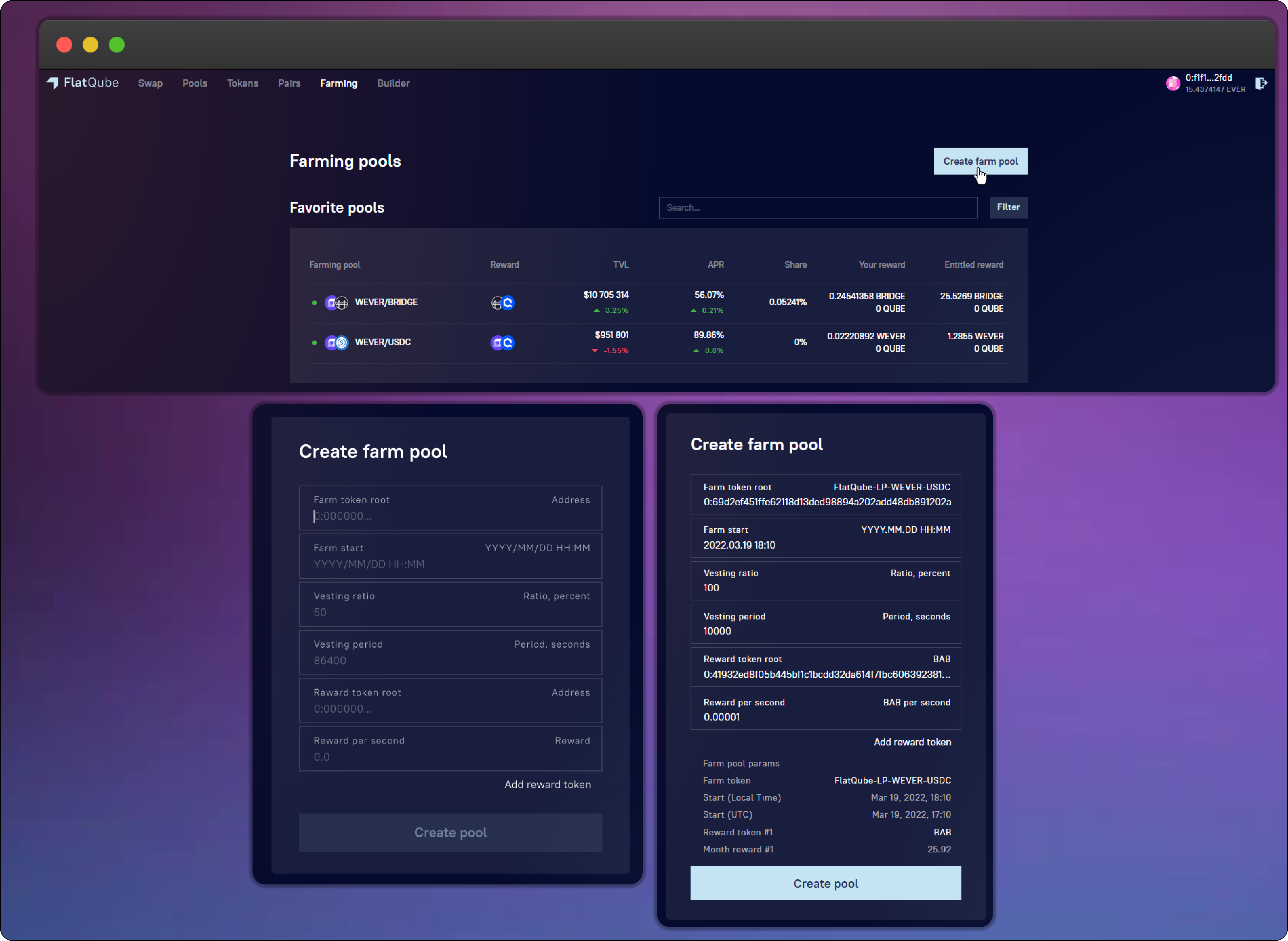 Click Create farming pool, confirm the transaction in your EVER Wallet and wait for the pool creation process to complete.