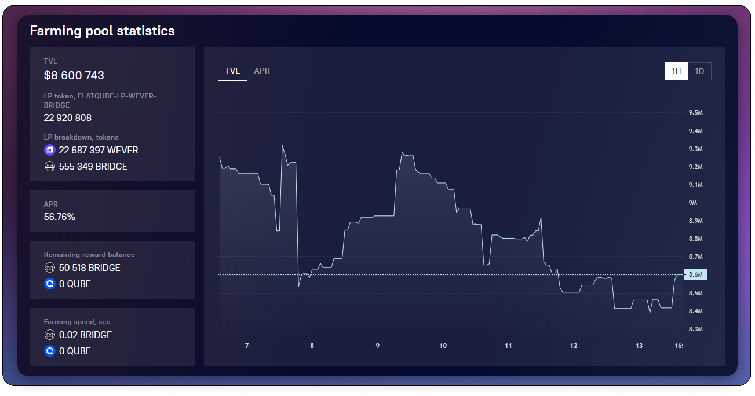 This block displays the [statistics ](https://docs.flatqube.io/use/farming/old-farming/interface/farm-page-user/statistics)of this Farming pool, as well as a graph of its TVL and APR.