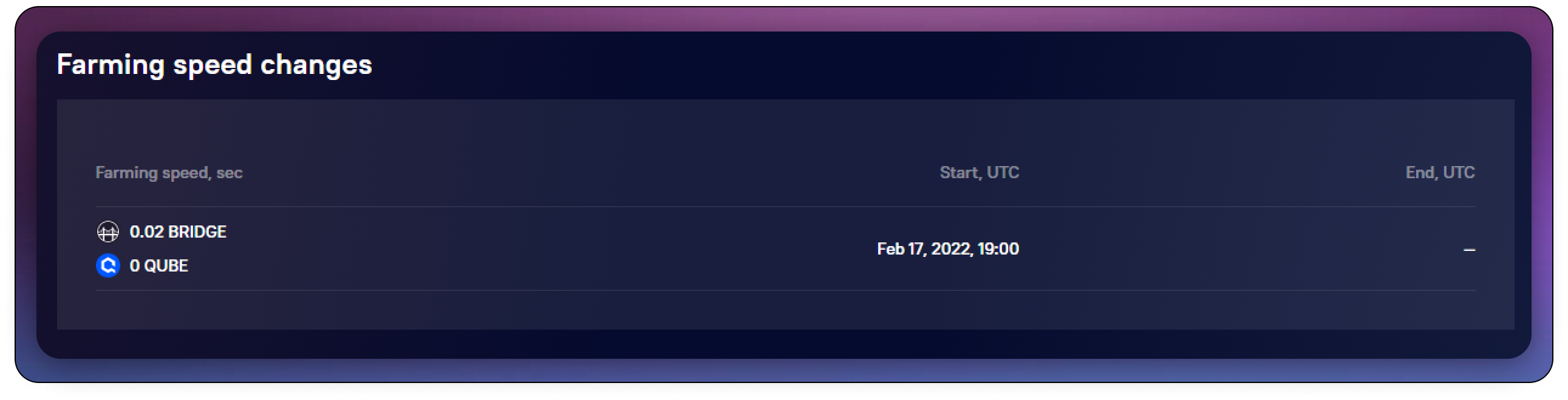 This block displays the current [Farming Speed](https://github.com/babowsk1/flatqube-docs/blob/main/use/farming/old-farming/interface/farm-page-user/broken-reference/README.md), as well as the history of its changes.