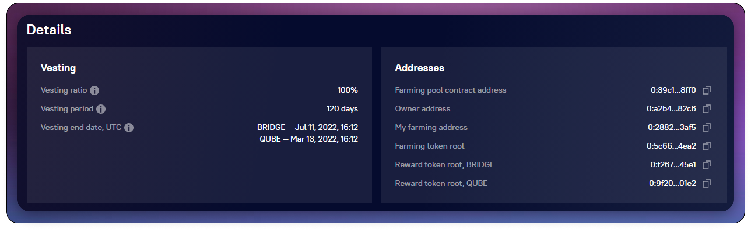 This block displays information about the [vesting ](https://docs.flatqube.io/use/farming/concepts/vesting)of this farming pool, as well as the addresses of contracts.