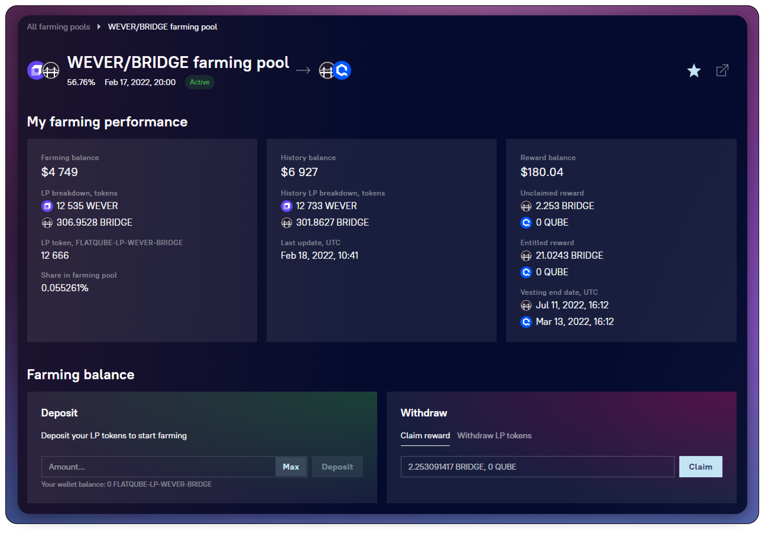 ### [My farming performance and Farming balances](https://docs.flatqube.io/use/farming/old-farming/interface/farm-page-user/farming-perfomance-and-balances)