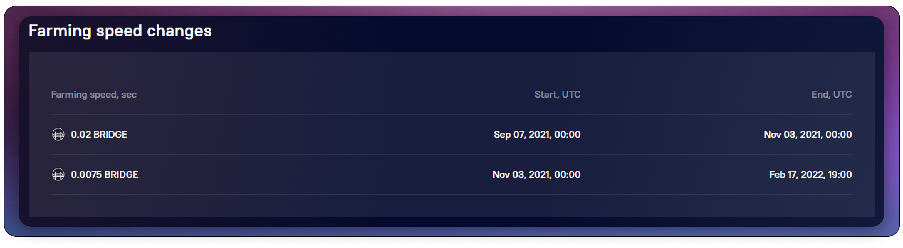 This block displays the current Farming speed. Recall that farming pool administrators can change the speed, so the history of changes to this parameter is also displayed here.
