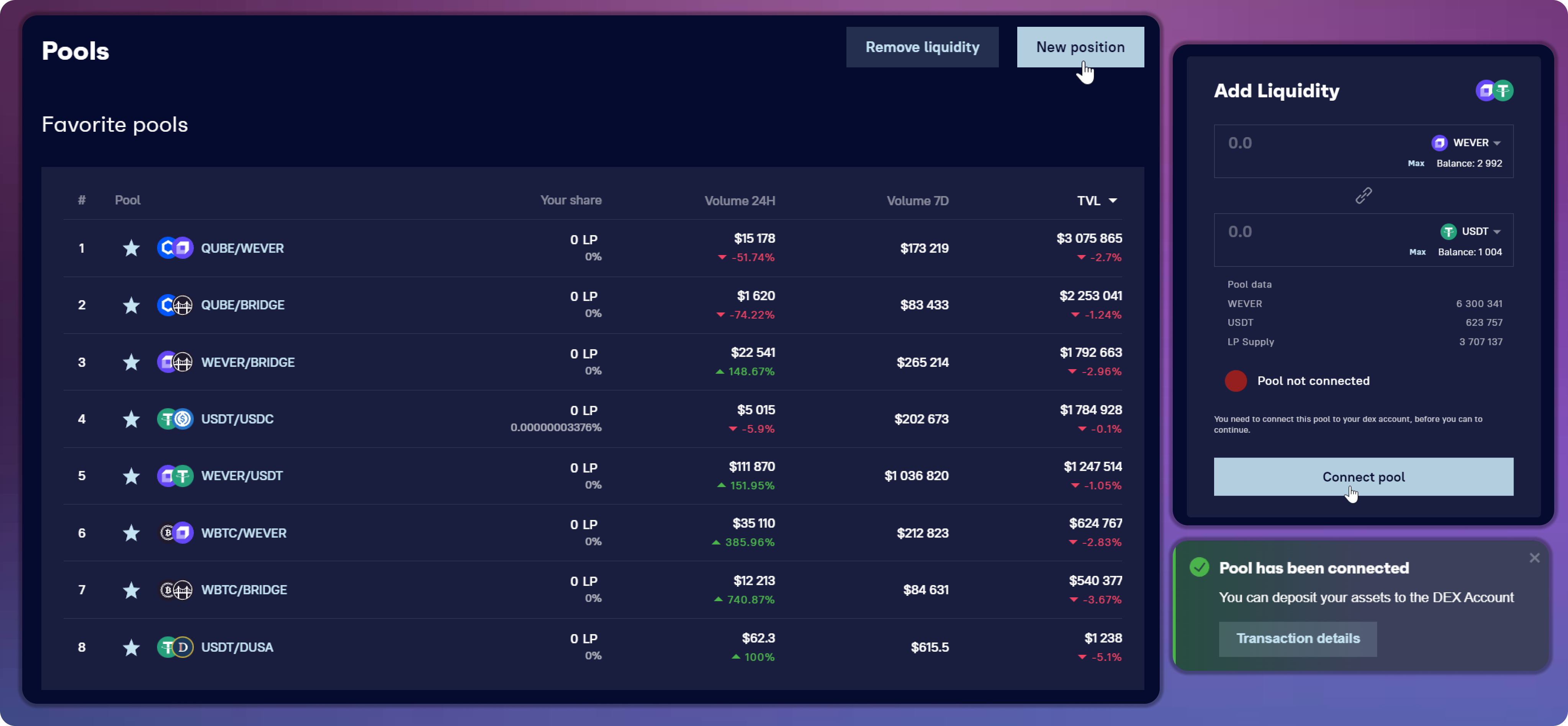 Congratulations! You have successfully deposited your tokens into the pool. In exchange for the provided liquidity, you will receive LP tokens, which you can then use in the corresponding farming pool.
