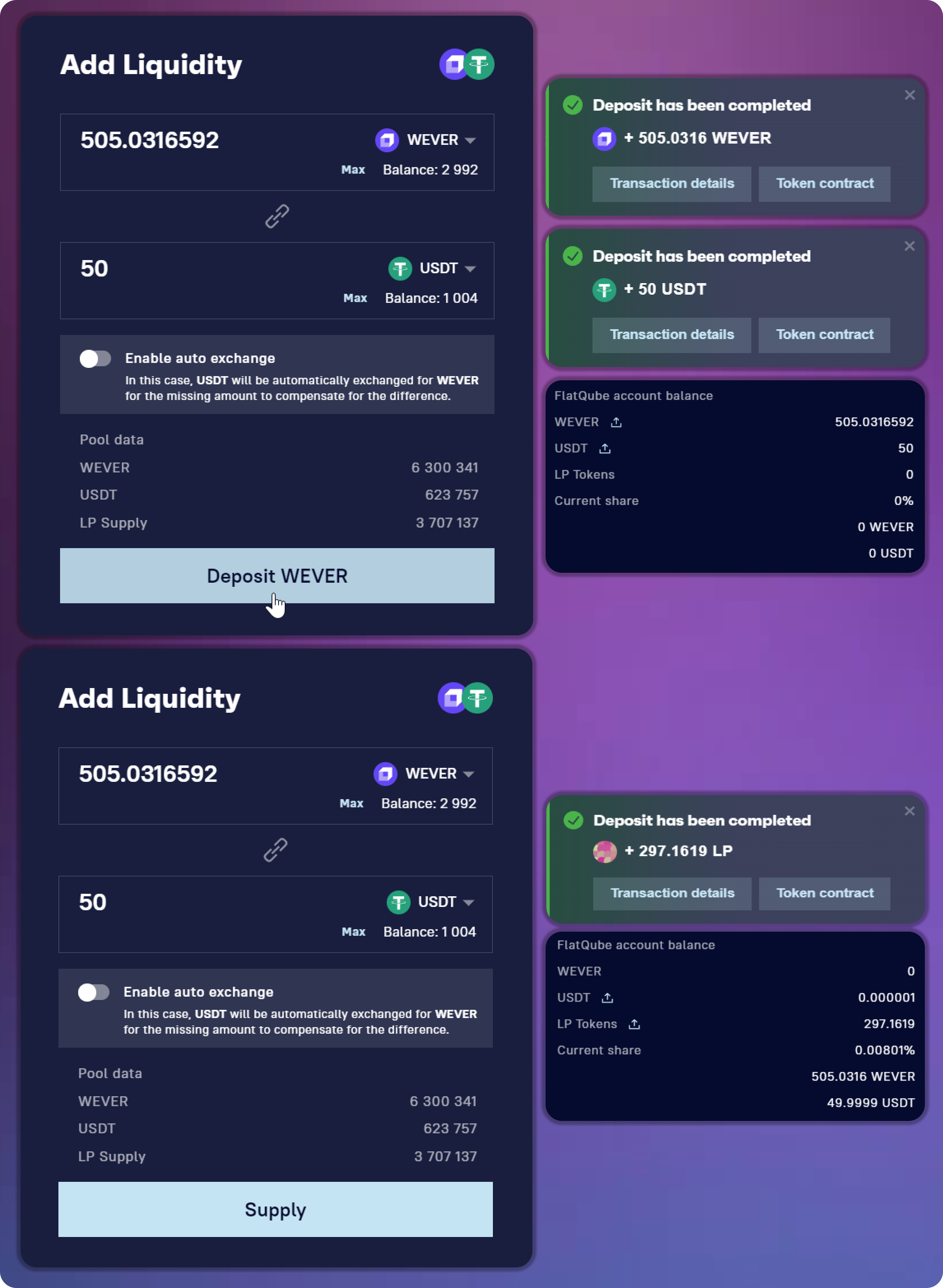 Deposit Token 1and confirm the transaction in the Ever Wallet window that opens. After the transaction is completed, if you have not used auto-exchange, do the same action for the second token.Wait for the token deposit transaction to complete and click Supply. Confirm the transaction in the Ever Wallet window that opens and wait for it to complete.