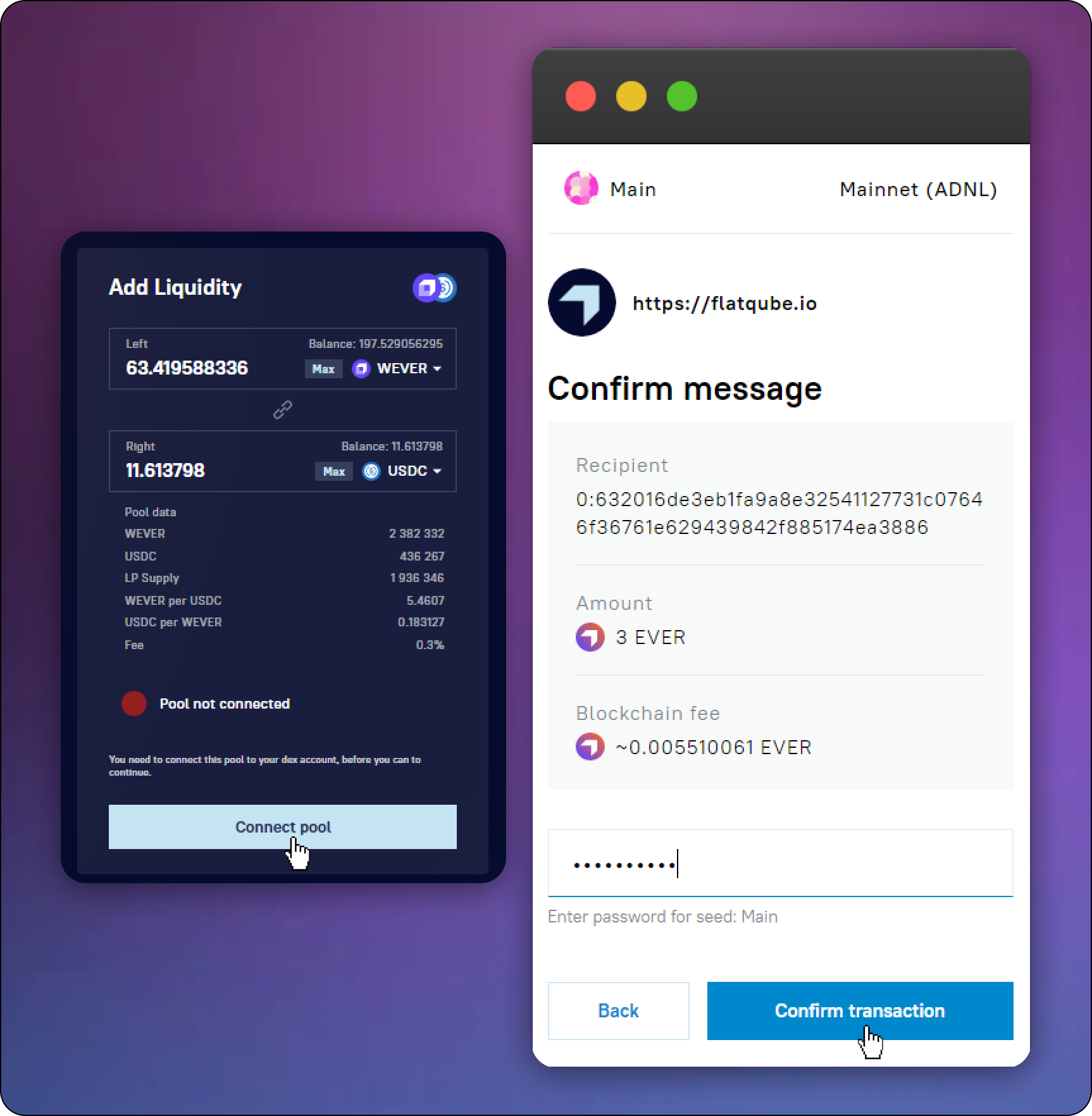 When you [add liquidity](https://docs.flatqube.io/use/pools/how-to/add-liquidity) to a particular pool for the first time, you will need to connect your DEX account to that pool. To do this, click **Connect pool** and confirm the transaction to your EVER Wallet.\